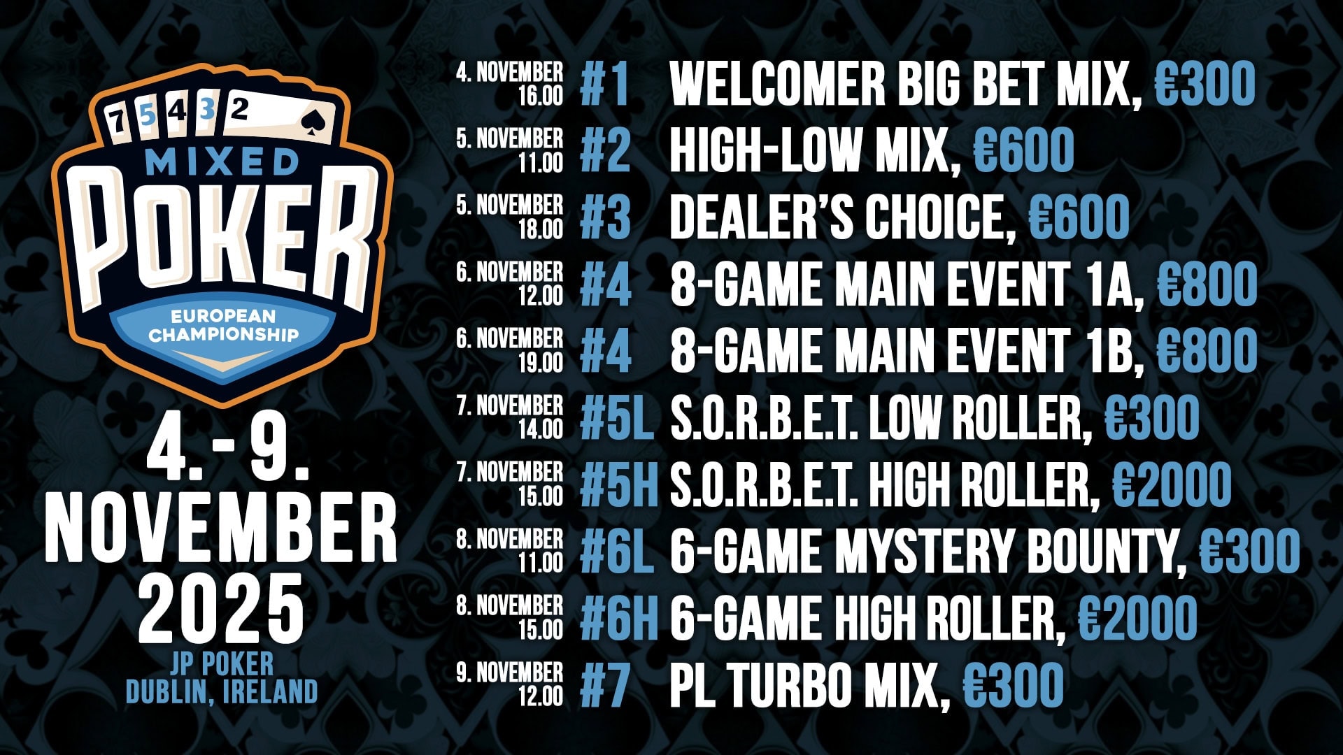 European Mixed Poker Championship (EMPC) spilles fra mandag og seks dager fremover på JPs kortklubb i Irlands hovedstad Dublin. JP er i Norge mest kjent som turneringssjef under poker-NM i utlandet.