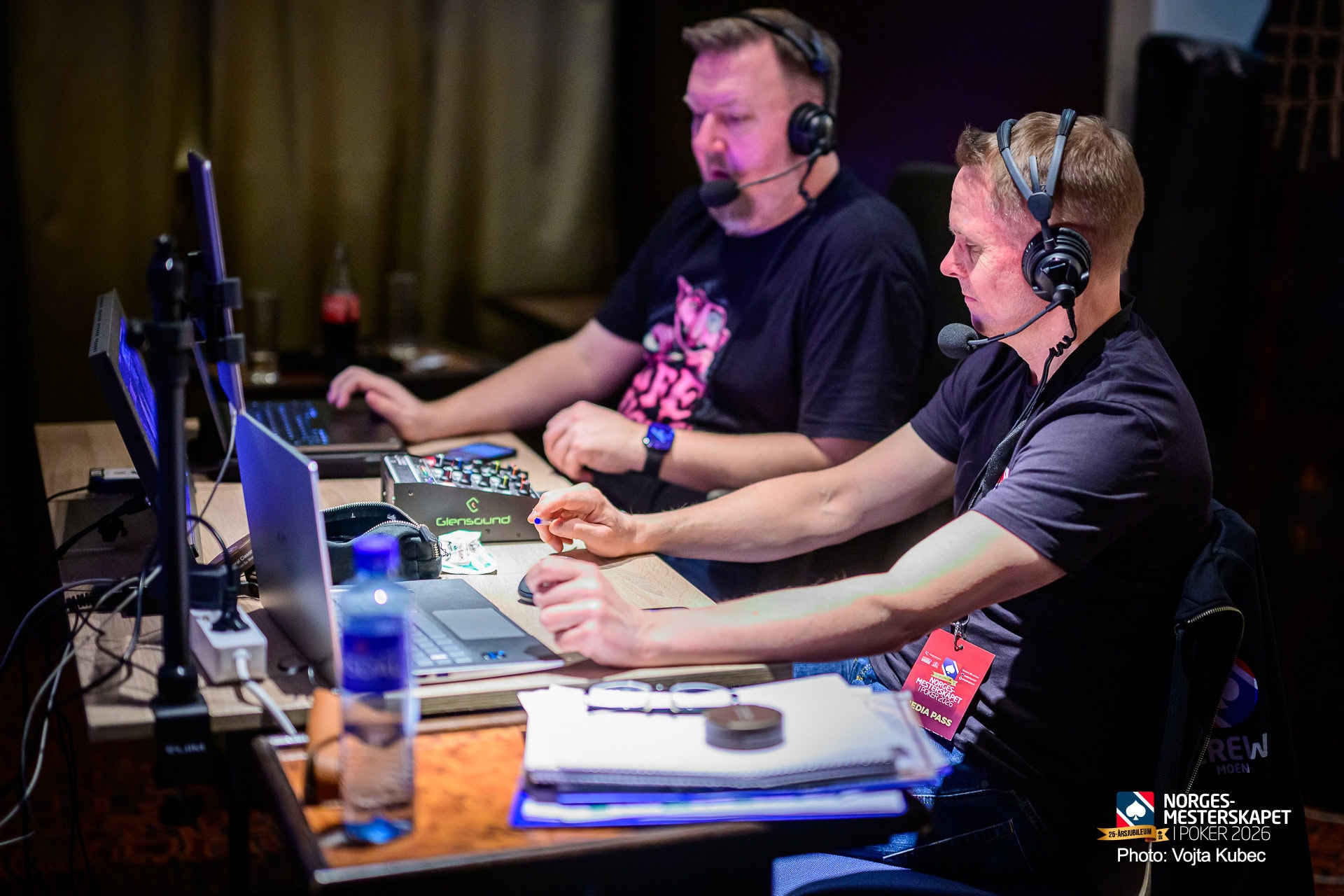 Direktesport-kommentatorene Stig Moen og Kjetil Flåten imponeres av hvordan Espen Hagen har gått løs på oppgaven med å beholde Main-Event-tittelen i poker-NM i Bratislava.