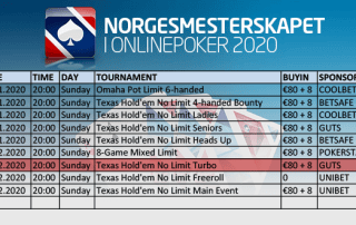 Her er praktiske detaljer om Main Event i online-NM i poker 2020. Main Event er den siste turneringen i online-NM som har pågått siden den første helgen i januar. Her er en oversikt over alle som har blitt norgesmestere i vinter. Når: Søndag 23. februar 2020 klokken 20.00. Turneringen pauses [Les mer >>]