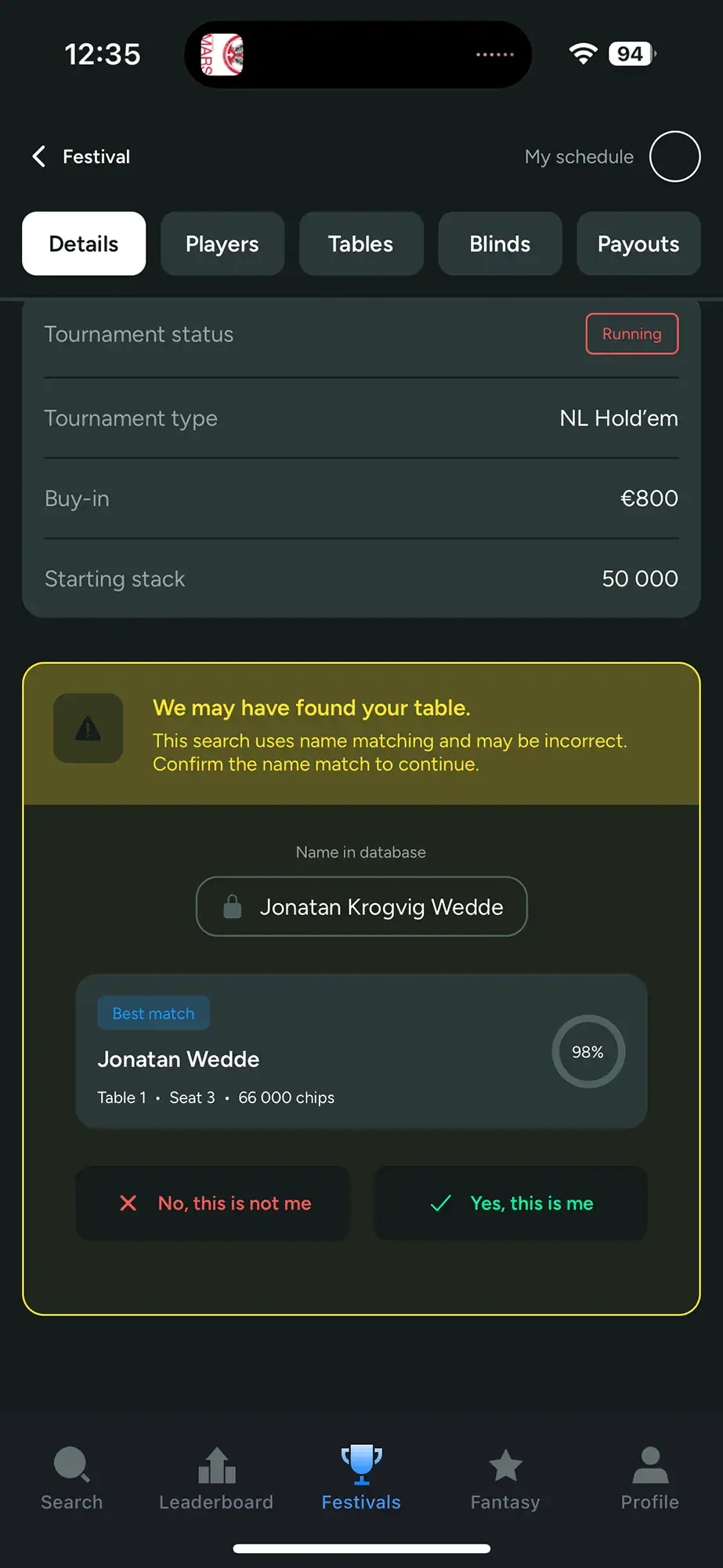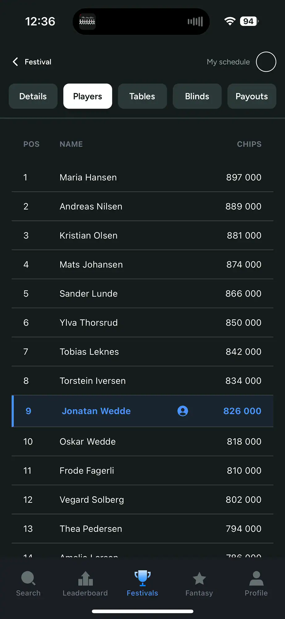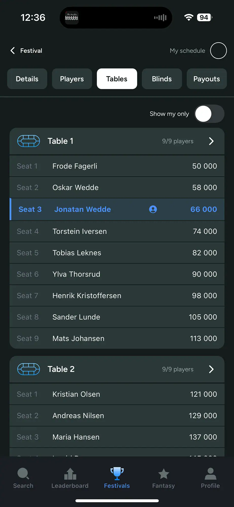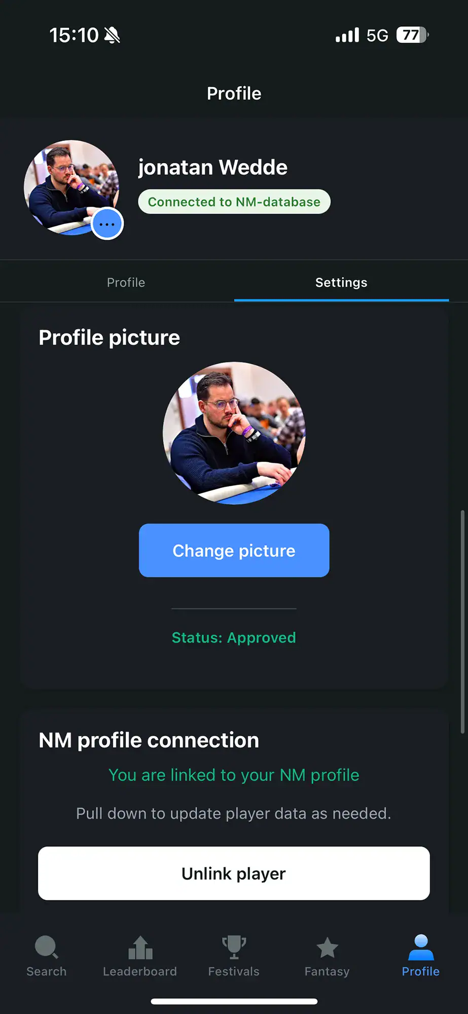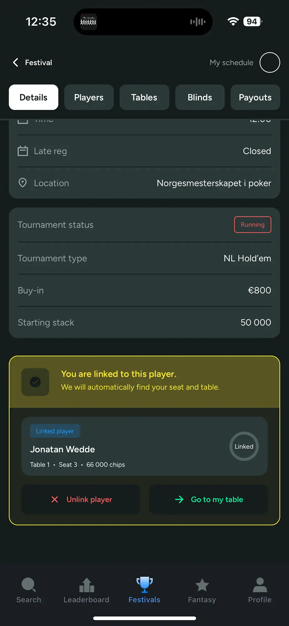Når du deltar i en turnering kan du koble profilen din direkte til spilleren din. Resultatet er at navnet ditt blir tydelig markert i listene, noe som gjør det langt enklere å navigere i store felt og finne riktig bord og sete.