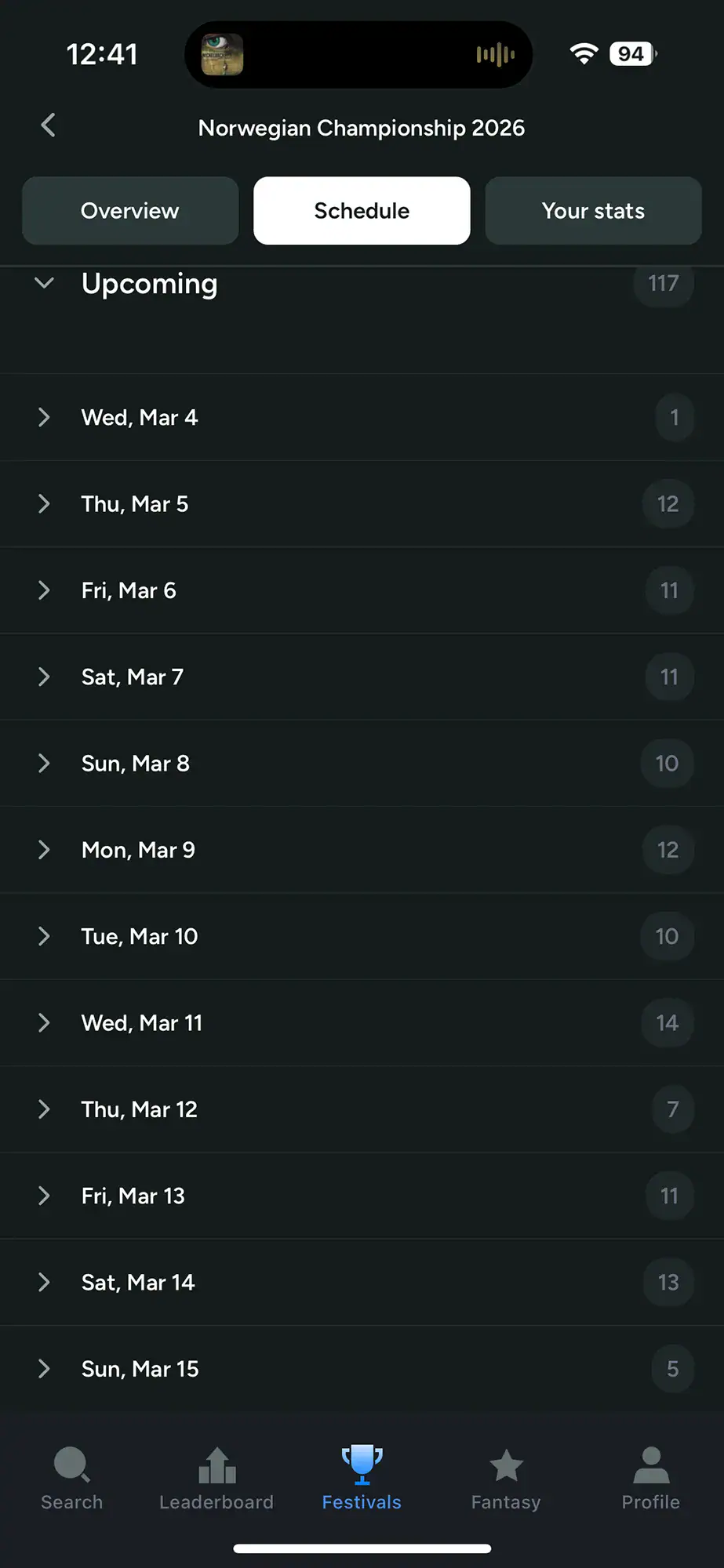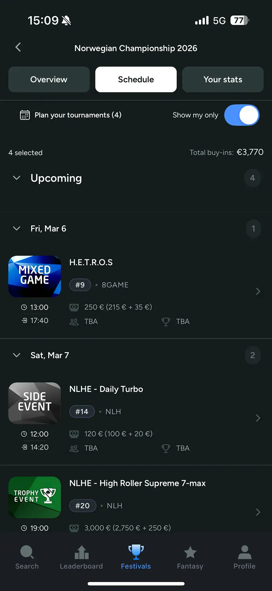 Aktive og kommende festivaler presenteres tydelig i appens hjem-skjerm. Foreløpig gjelder dette blant annet Freeroll NM og Poker NM 2026 i Bratislava.