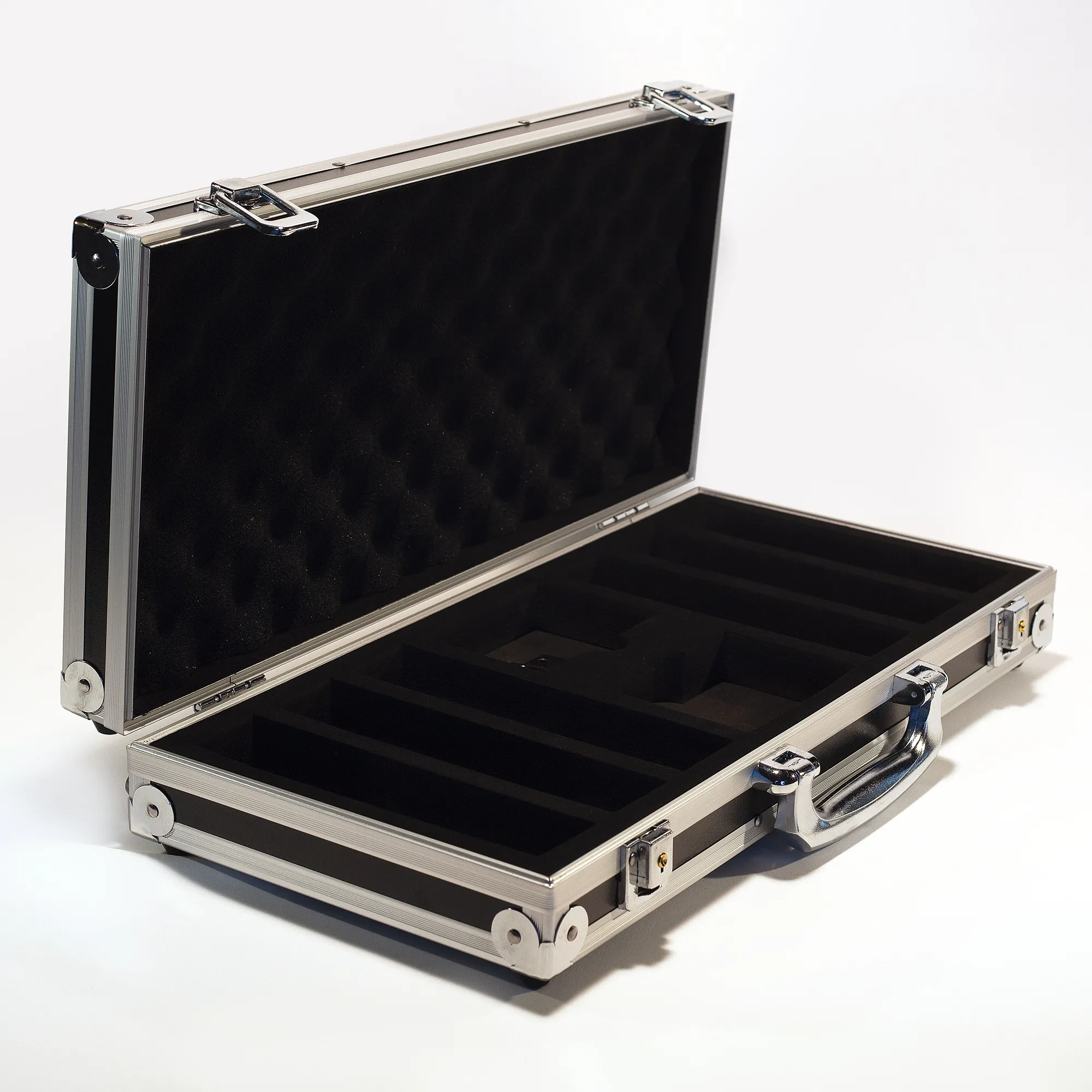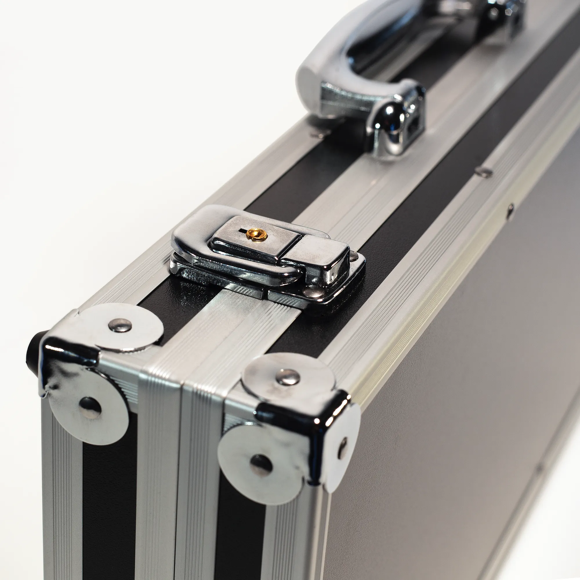 Pokerkoffert av aluminium inneholdende 300 stk kompositt pokersjetonger med Spar- eller NM-design, med valgfrie valører. Størrelse 45×21,2×7,9 cm.