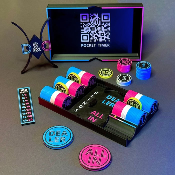 - Egen digital poker-timer direkte på mobilen – åpnes enkelt via QR-kode i lokket.